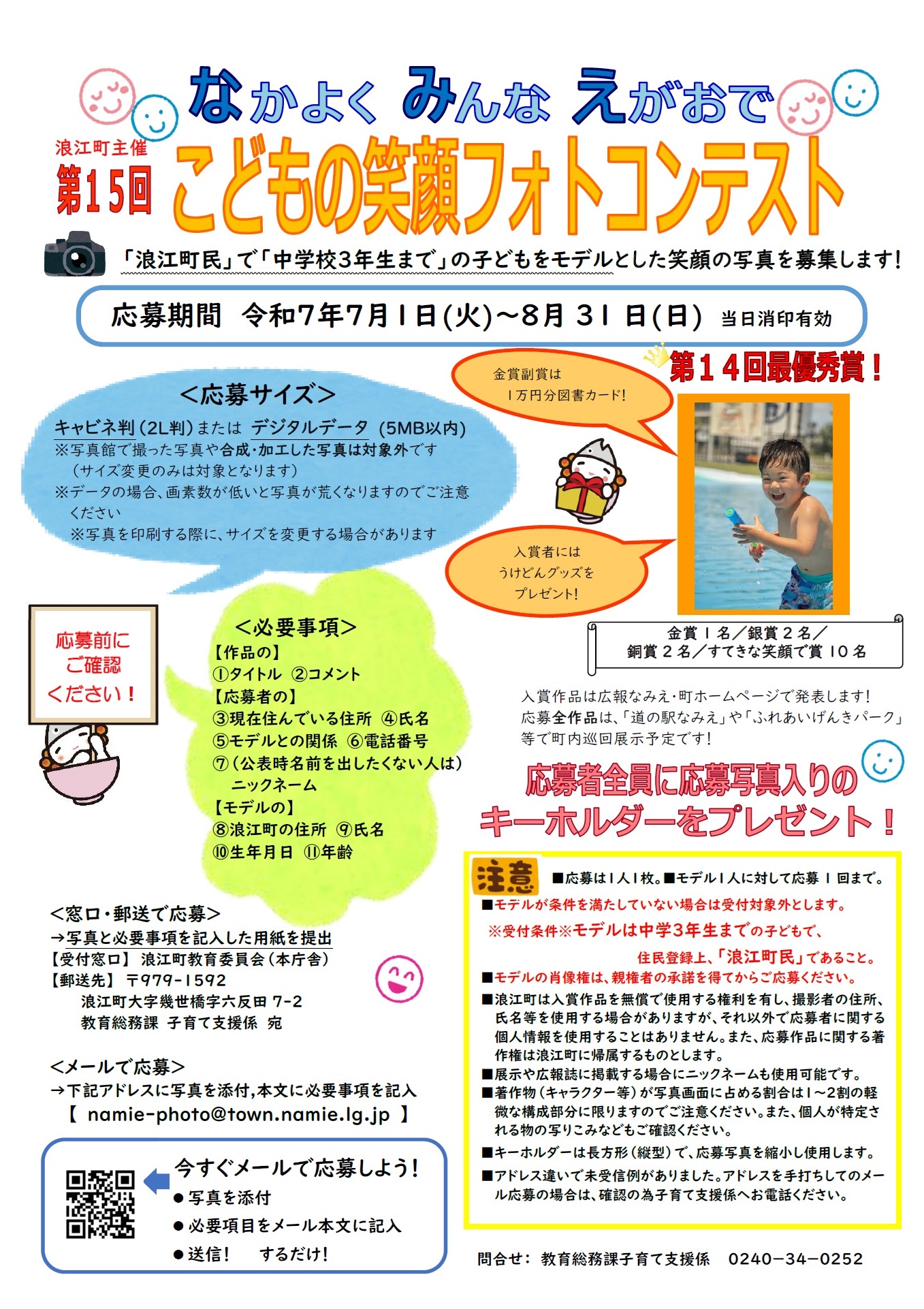 浪江町では、健やかに育つ浪江の子どもたちの笑顔を通して、子育てに対する不安の軽減と喜びを感じていただくため、平成19年度より、「なかよく みんな えがおで」をテーマに、子どもたちの笑顔の写真を募集してコンテストを開催しています。震災により一時中断しましたが、平成27年度に再開し、今年度で15回目を迎えました。
