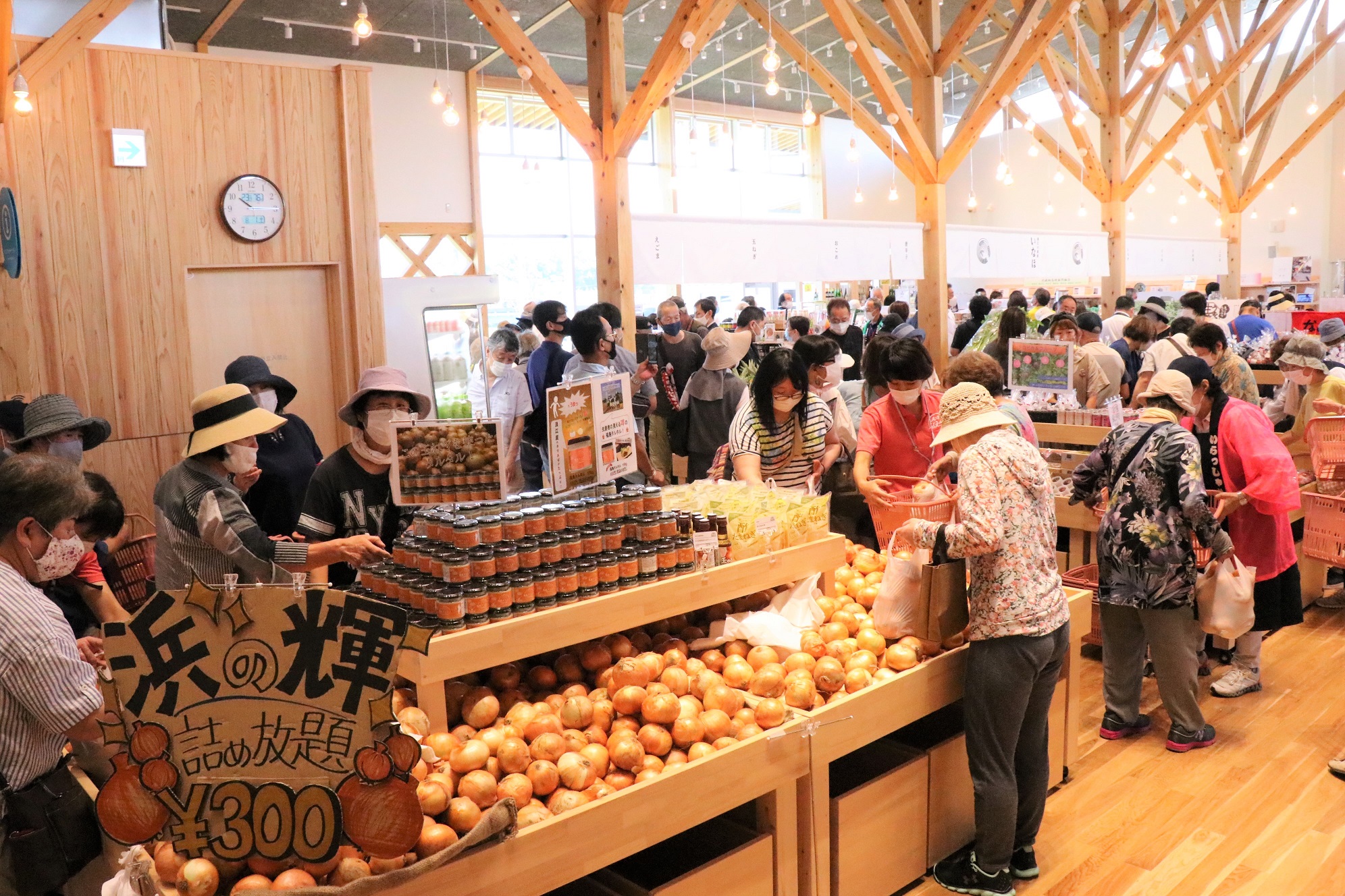 館内では、町内で採れた新鮮な野菜や海産物、地酒、道の駅なみえ限定商品 などが豊富に並んだ「いろどり産直 いなほ」、「なみえ焼そばパン」や 「なみえ焼そばソフトクリーム」など「道の駅なみえ」ならではの味が楽しめる 「まちのパン屋さん ほのか」で、多くの人たちが買い物を楽しみました。