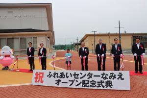 オープン記念式典では、施設の愛称や概要説明をはじめ、たくさんの人から祝辞をいただきました。また「ふれあいセンター」のオープンを記念してテープカットが執り行われ、最後には「いくどはぁ★なみぃ」の歌と踊りで記念式典を盛り上げました。