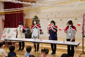 12月21日(水)、浪江にじいろこども園においてクリスマス会が開催されました。0歳児さんたちは初めて見るサンタさんにびっくりしてしまいましたが、そのほかの園児たちはサンタさんからのプレゼントに大喜びです。最後はサンタさんと一緒に踊ってクリスマス会を楽しみました。